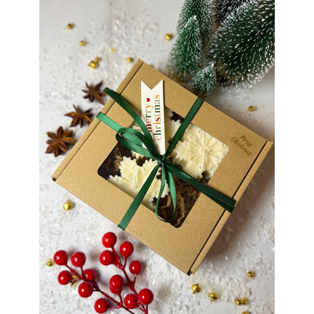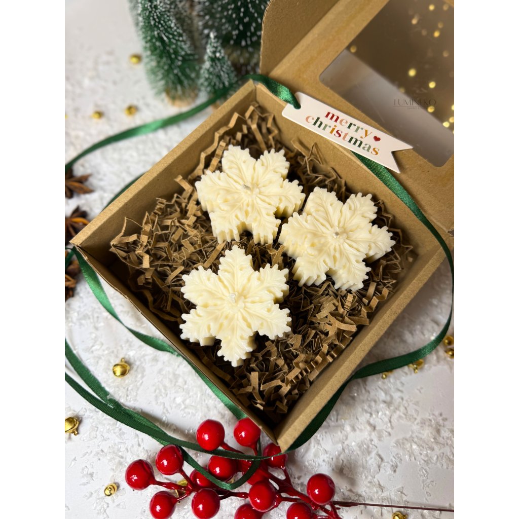V elegantnom darčekovom balení sa ukrývajú tri ručne odlievané sójové sviečky v tvare vločky. Každá sviečka je vyrobená tak, aby do vášho domova vniesla kúzlo Vianoc.