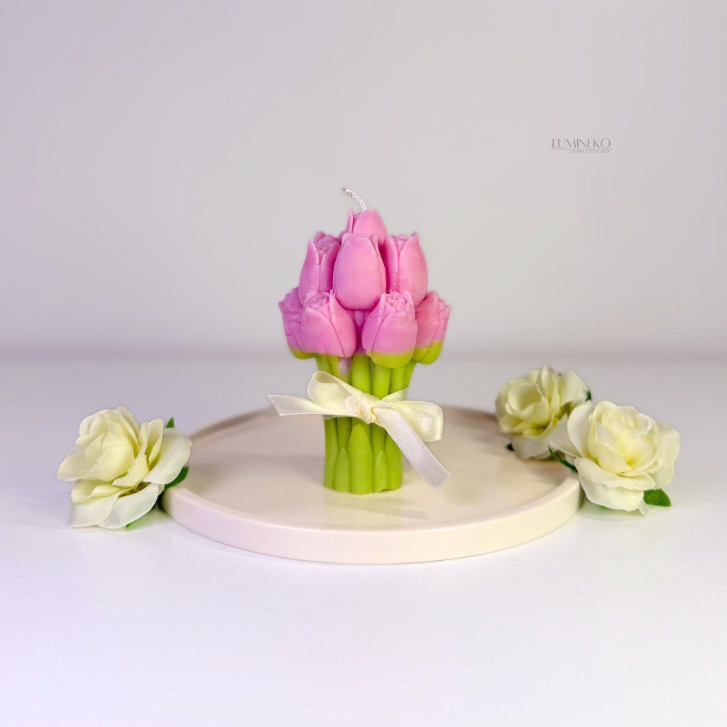 Ručne odlievaná dekoratívna sviečka z prírodného sójového vosku v tvare kytice tulipánov.