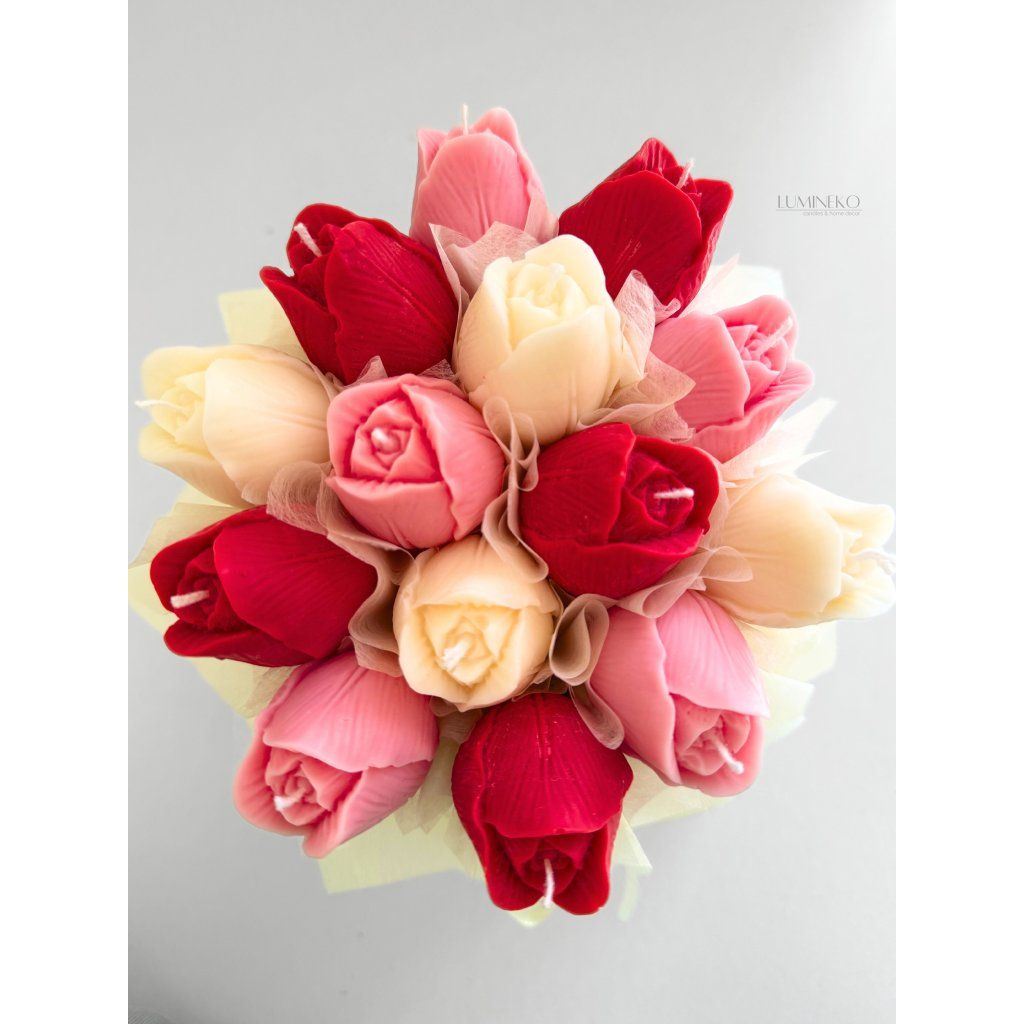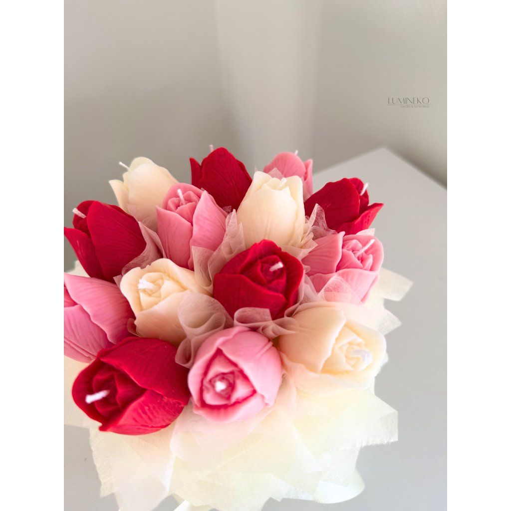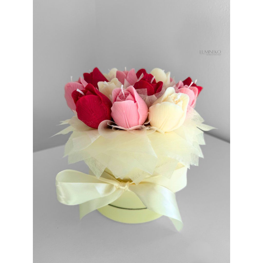 Box obsahuje 14 „večných“ tulipánov zo 100 % prírodného sójového vosku s jemnou vôňou rozkvitnutých ruží. Kvety nikdy nezvädnú a keď sa rozhodnete pre zmenu, môžete ich jednoducho zapáliť a premeniť túto dekoráciu na vonnú sviečku.