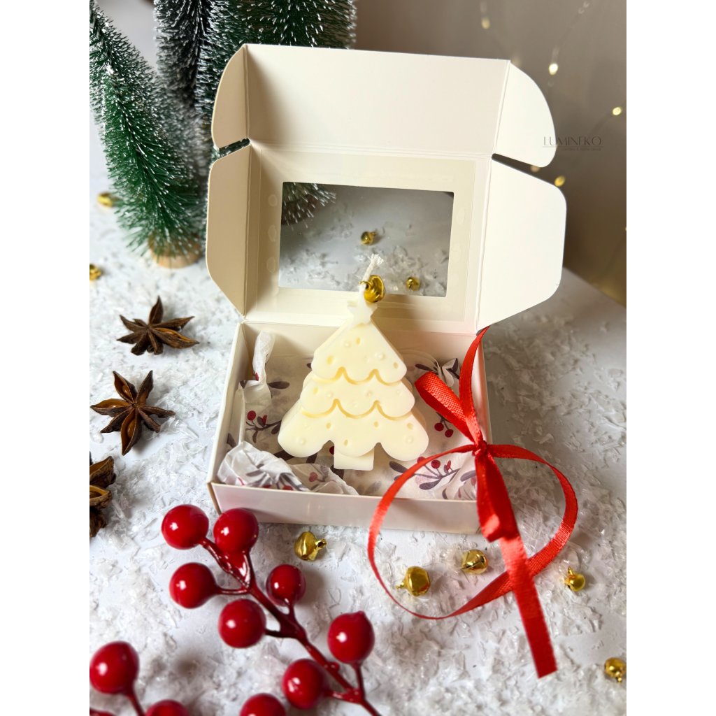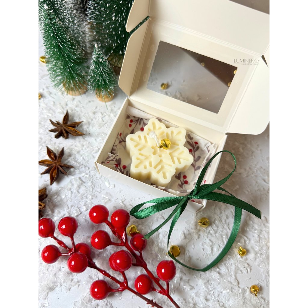 V elegantnom darčekovom balení sa ukrýva ručne odlievaná sójová sviečka podľa vášho výberu – vločka alebo vianočný stromček.