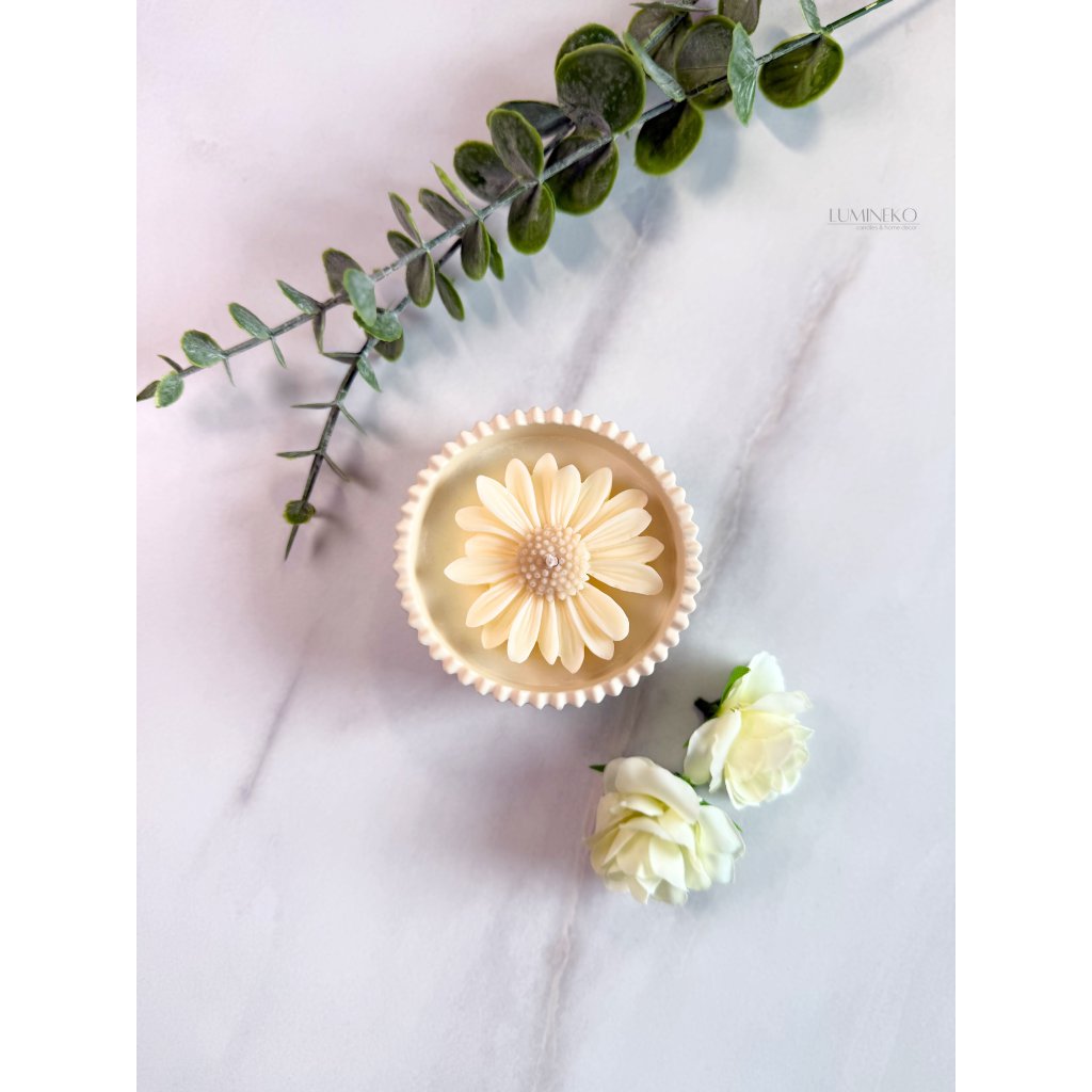Ručne vyrábaná sviečka zo sójového vosku v nádobke z jesmonitu. Sviečka je zdobená sedmokráskou, ktorá jej dodáva nežný dotyk prírody. Sedmokráska je symbolom čistoty, radosti a novej energie.