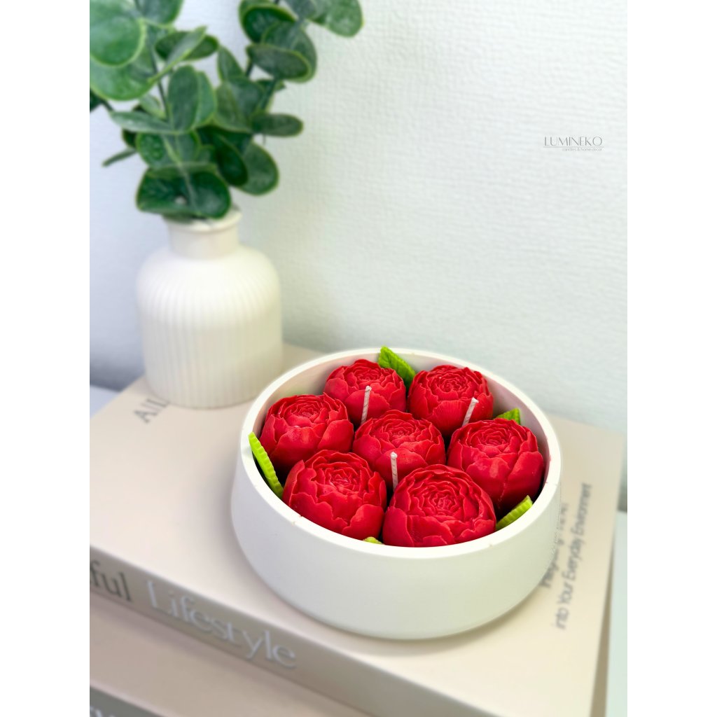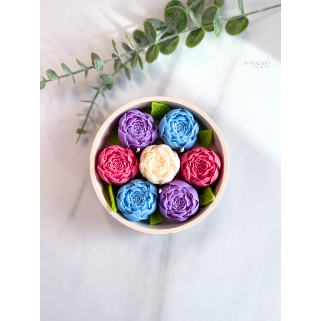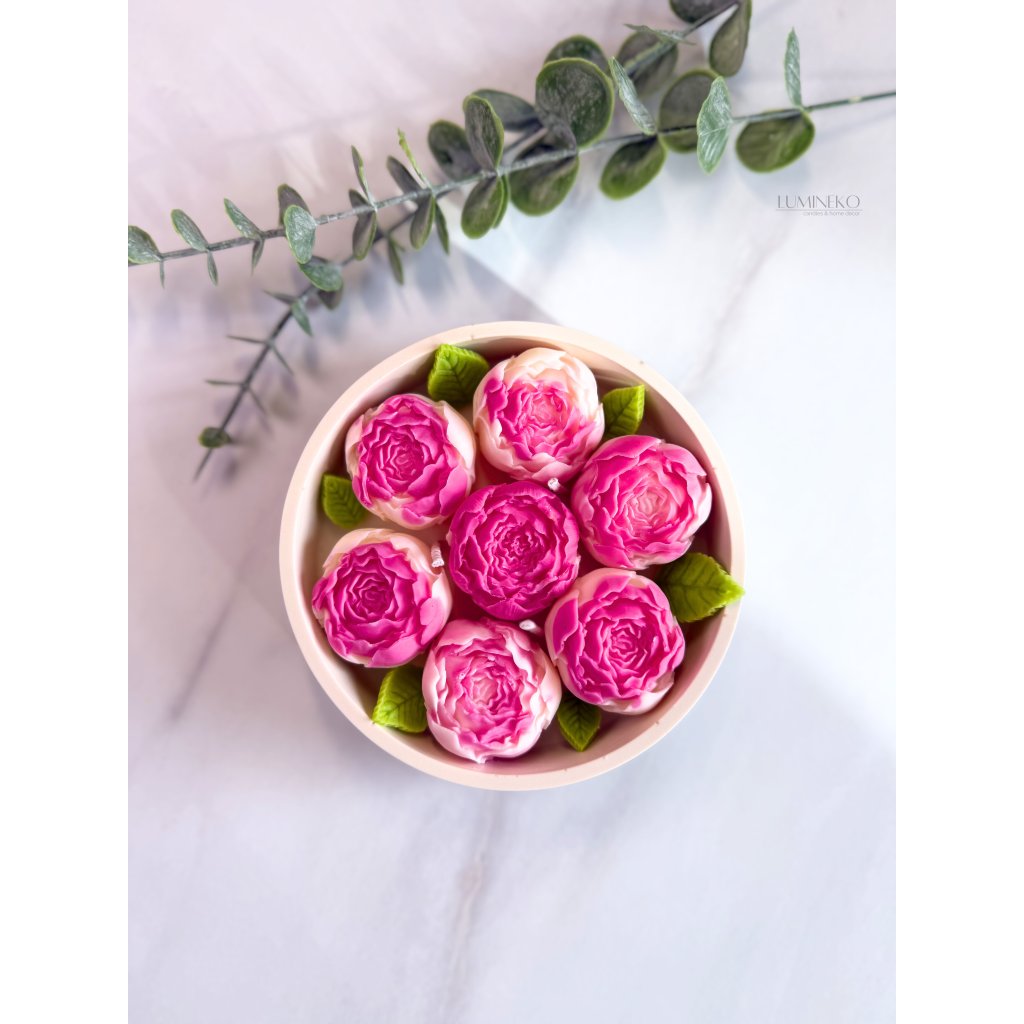 Ručne vyrábaná sviečka zo sójového vosku v nádobke z jesmonitu. Sviečka je zdobená jemnými pivoňkami, ktoré vytvárajú elegantný kvetinový detail. Pivoňka je symbolom krásy, jemnosti a romantiky.