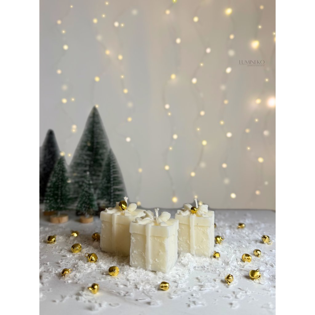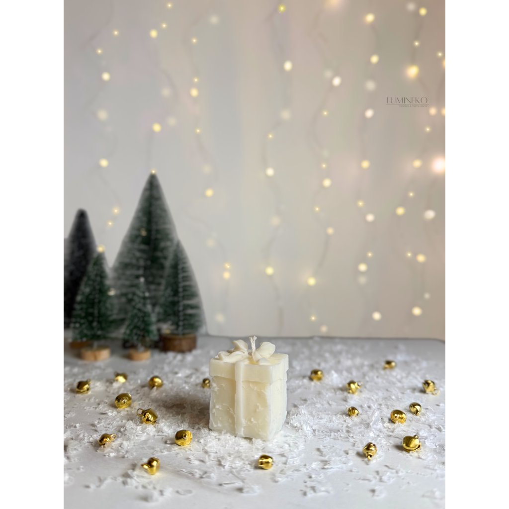 Ručne odlievaná vianočná sviečka v tvare darčeka. Vyrobená z prírodného sójového vosku pre chvíle naplnené teplom, svetlom a kúzlom Vianoc.