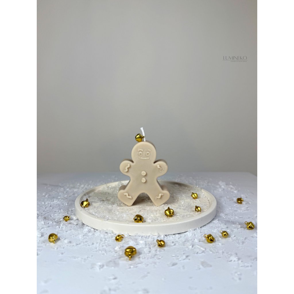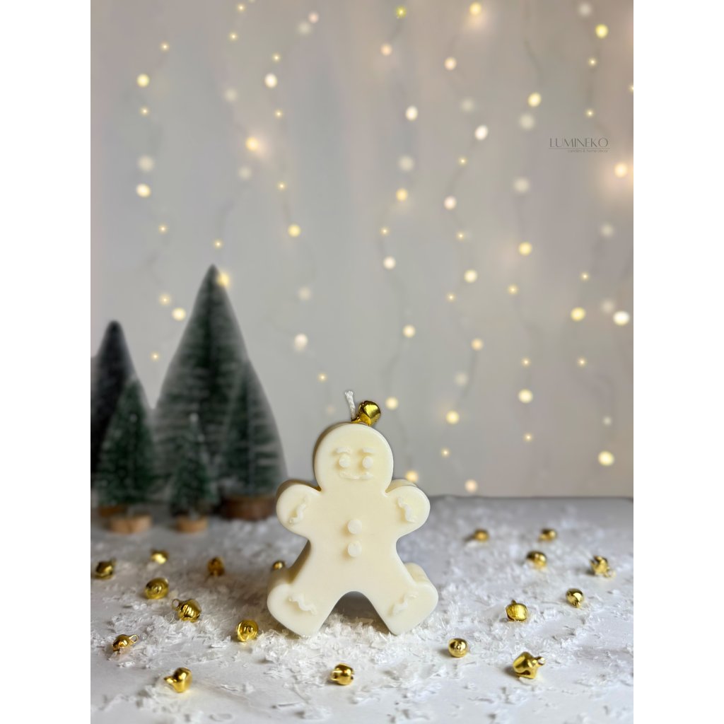 Ručne odlievaná dekoratívna vianočná sviečka v tvare perníčka. Vyrobená z prírodného sójového vosku pre chvíle naplnené teplom, svetlom a kúzlom Vianoc.
