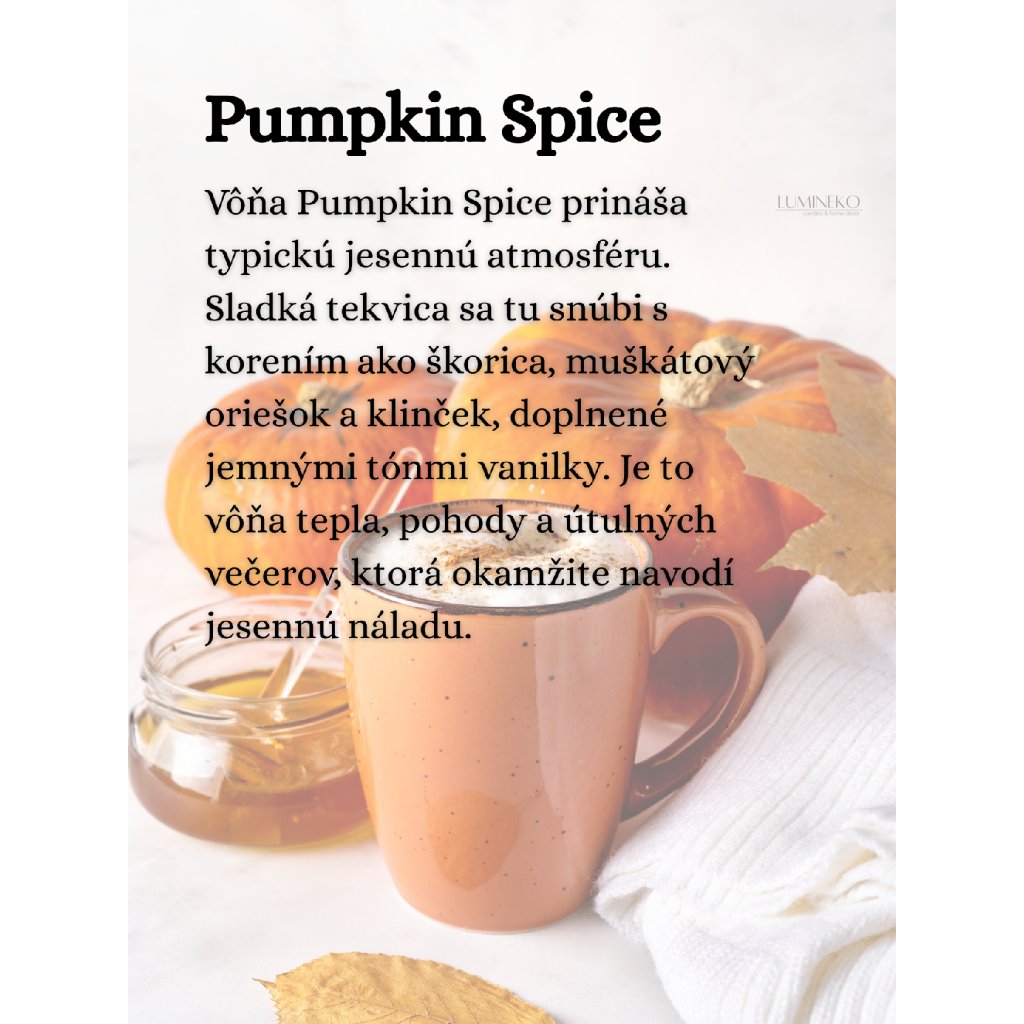 Vôňa Pumpkin Spice prináša typickú jesennú atmosféru. Sladká tekvica sa tu snúbi s korením ako škorica, muškátový oriešok a klinček, doplnené jemnými tónmi vanilky. Je to vôňa tepla, pohody a útulných večerov, ktorá okamžite navodí jesennú náladu.
