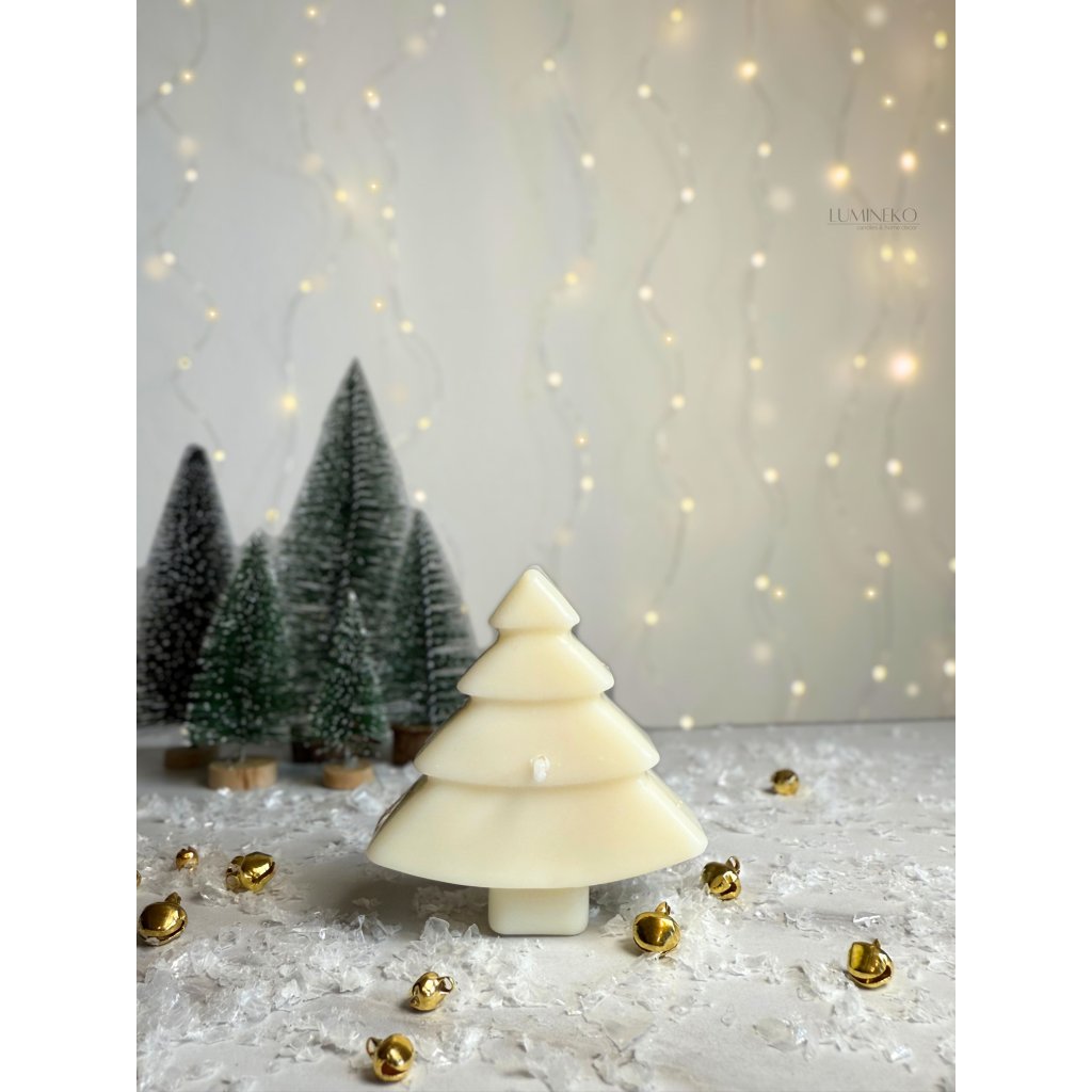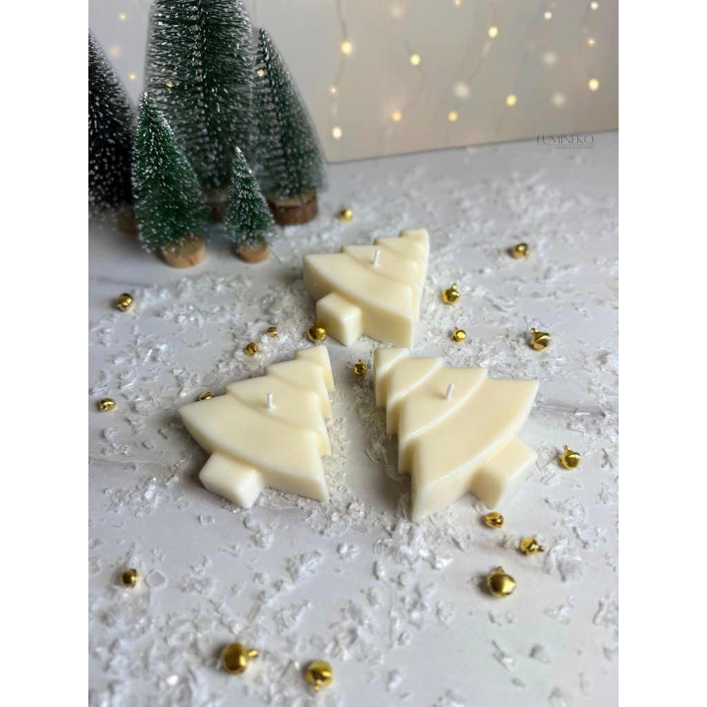 Ručne odlievaná dekoratívna vianočná sviečka v tvare stromčeka. Vyrobená z prírodného sójového vosku pre chvíle naplnené teplom, svetlom a kúzlom Vianoc.
