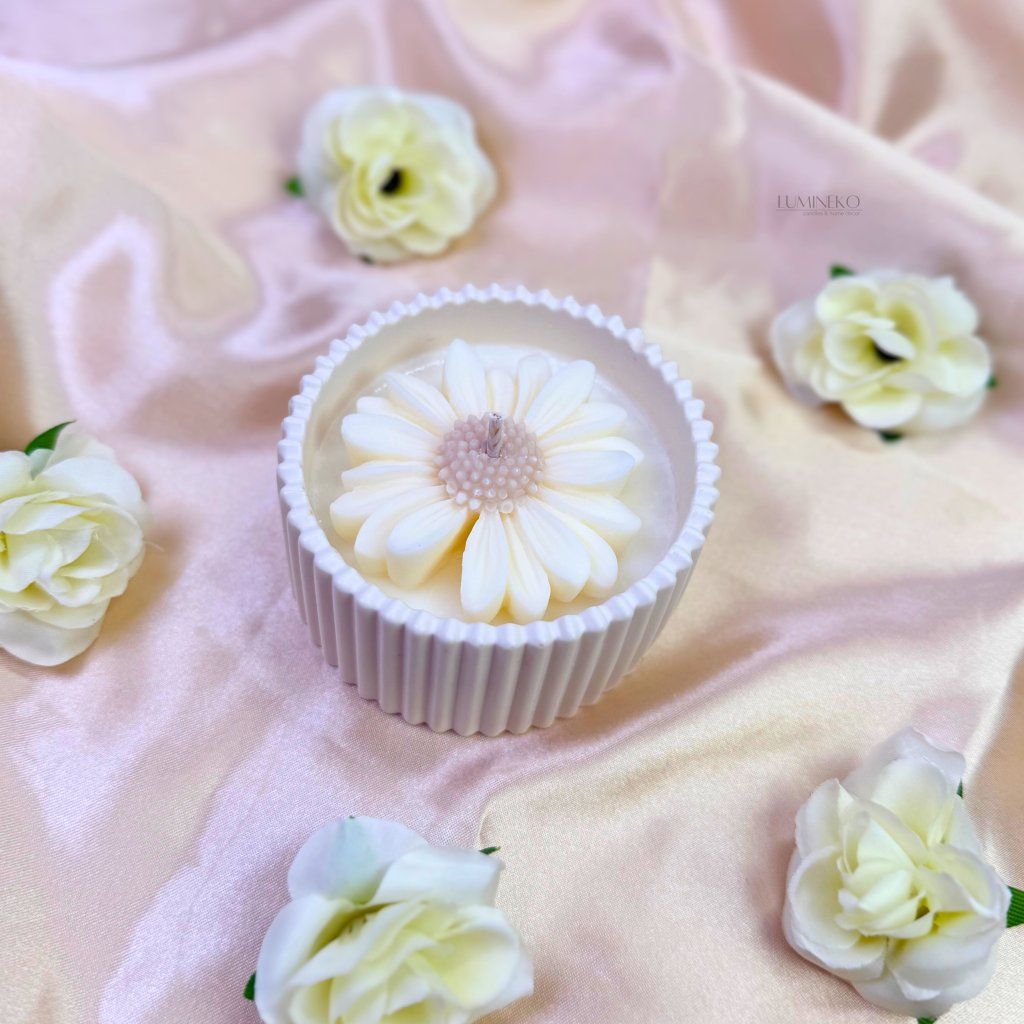 Ručne vyrábaná sviečka zo sójového vosku v nádobke z jesmonitu. Sviečka je zdobená sedmokráskou, ktorá jej dodáva nežný dotyk prírody. Sedmokráska je symbolom čistoty, radosti a novej energie.
