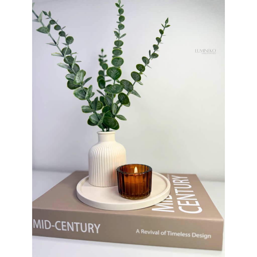 Sklenený svietnik na čajovú sviečku v jantárovej farbe.