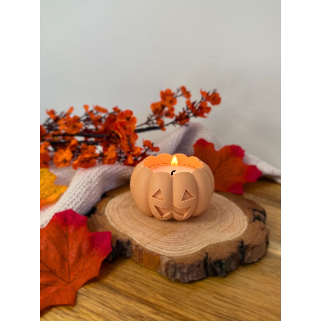 Ručne vyrábaný svietnik z jesmonitu v tvare vyrezávanej tekvičky – každý kus je originál.