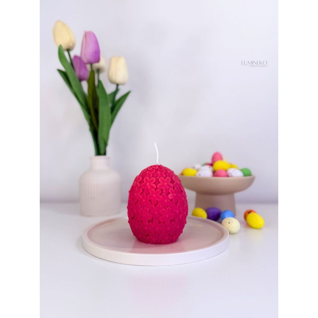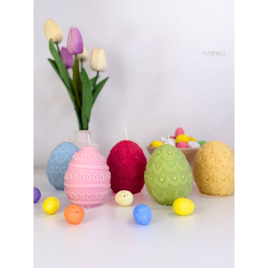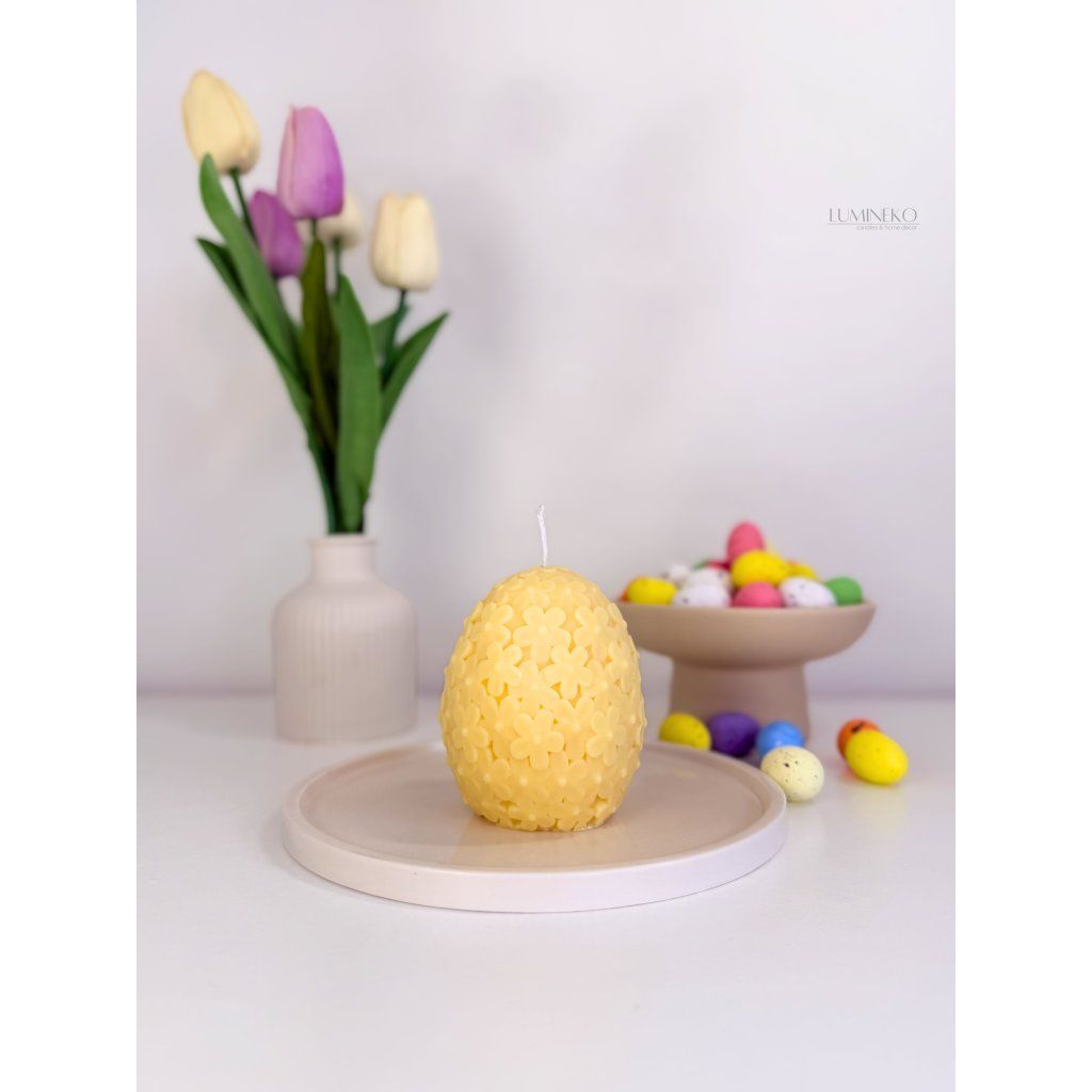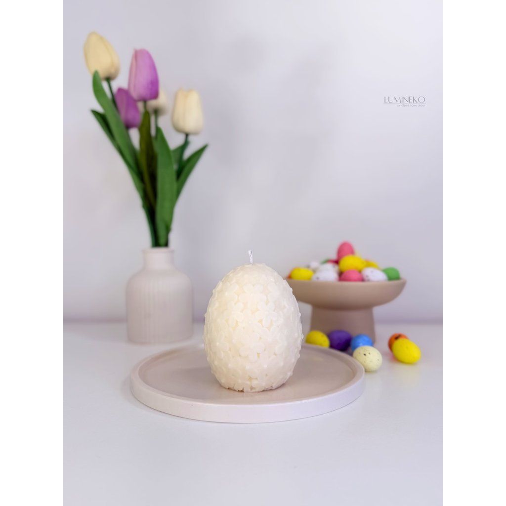 Ručne odlievaná veľkonočná sviečka v tvare vajíčka z prírodného sójového vosku.