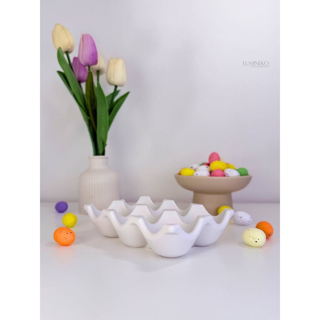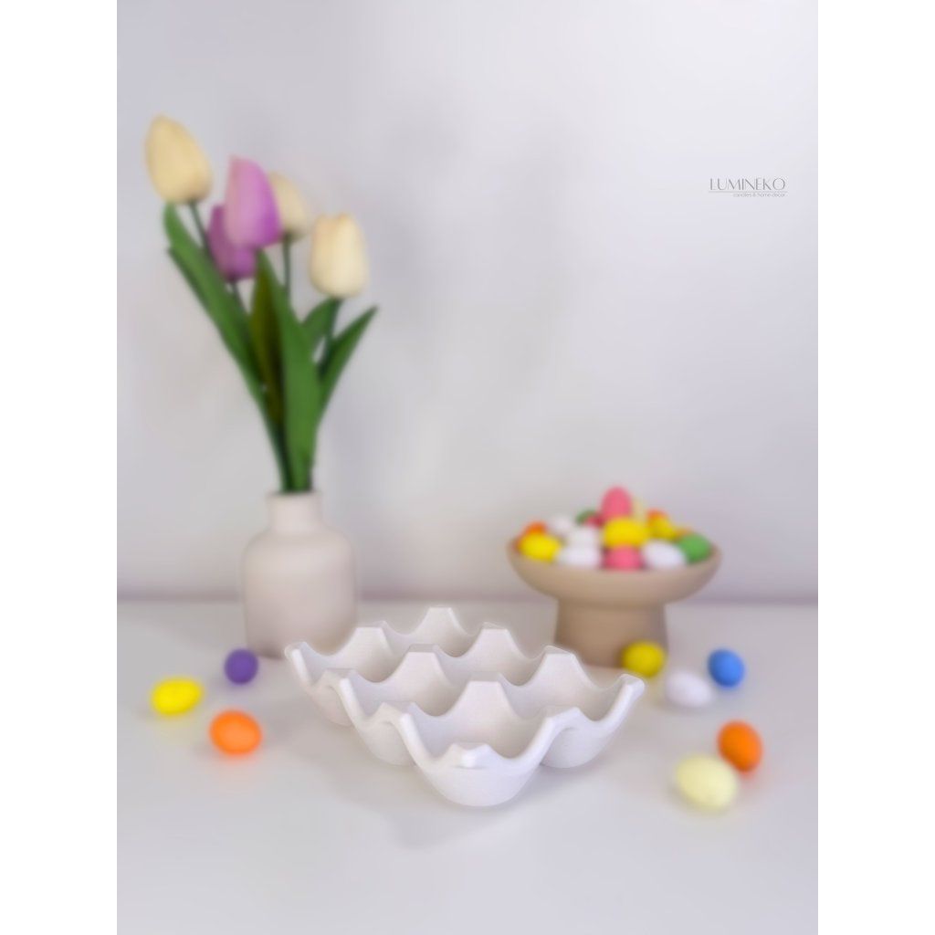 Veľkonočná dekorácia v tvare podnosu na vajíčka. Elegantný a minimalistický doplnok k veľkonočnej atmosfére. Stačí doplniť veľkonočné vajíčka a vytvoríte krásnu sviatočnú výzdobu. Odporúčame doplniť sviečkami z našej veľkonočnej kolekcie.