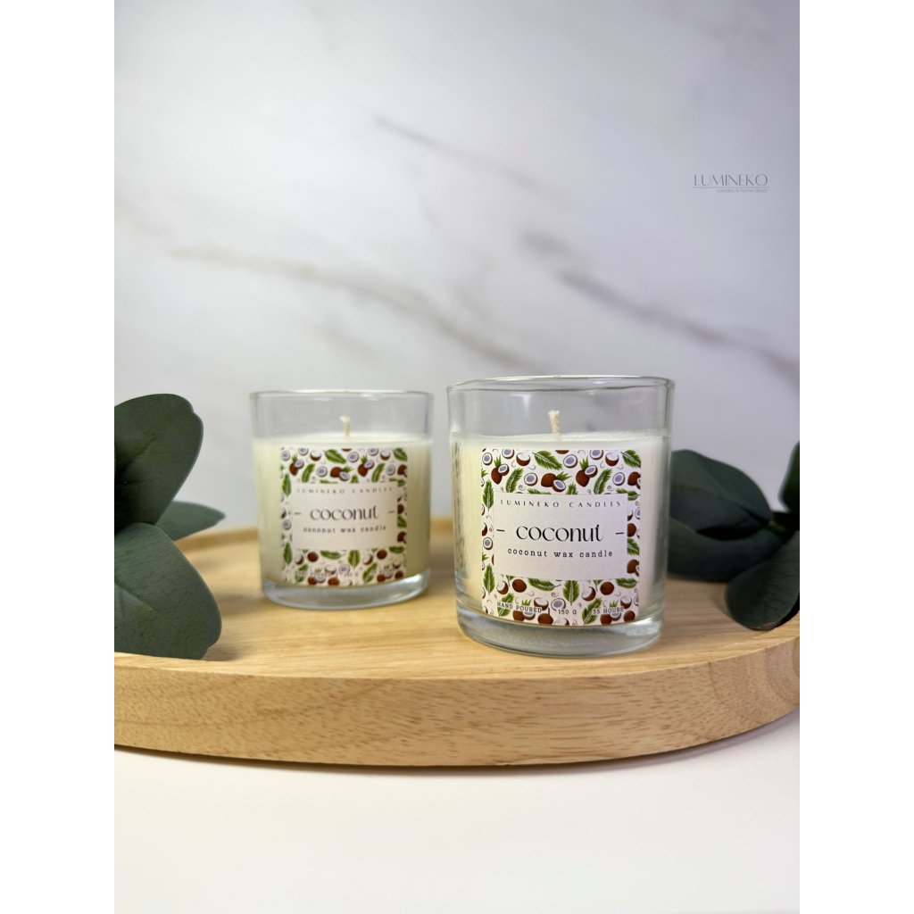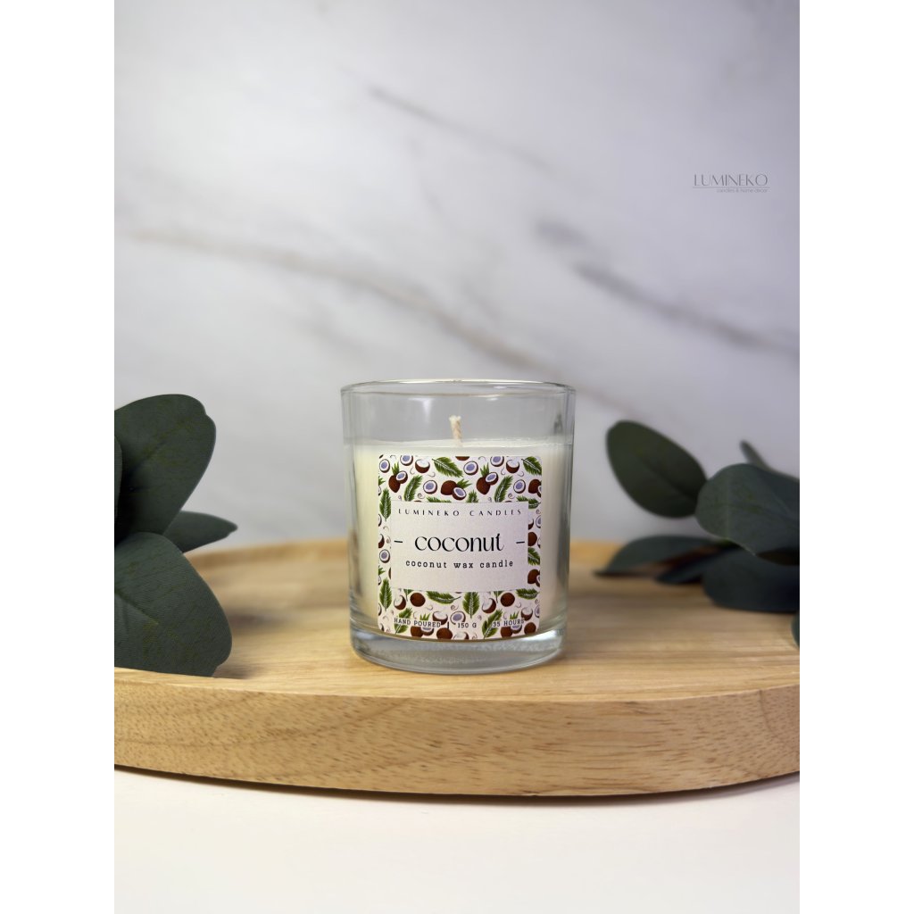 Ručne vyrábaná sviečka z kokosového vosku v elegantnej sklenenej nádobe s vôňou Kokos.