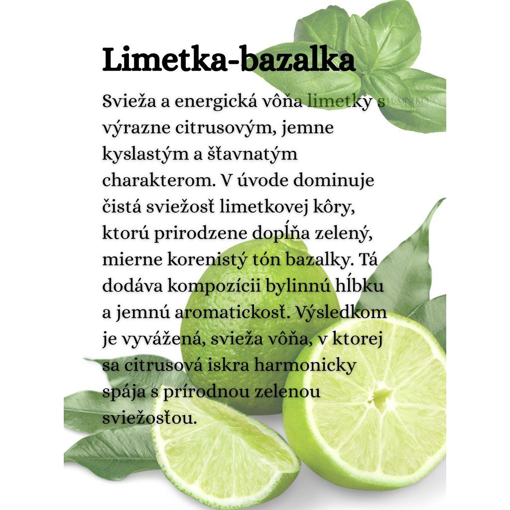 Svieža kombinácia limetky a bazalky, ktorá okamžite prebudí zmysly. Citrusová sviežosť limetky sa spája s jemnou bylinkovou vôňou bazalky, vytvára energizujúcu a zároveň harmonickú arómu, ktorá je ideálna na prevoňanie domova a povzbudenie nálady.